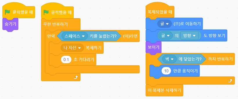 10만큼 움직이기를 벽에 닿을 때까지 반복합니다. 벽에 닿으면 10만큼 움직이기를 멈추고 복제본을 삭제합니다.