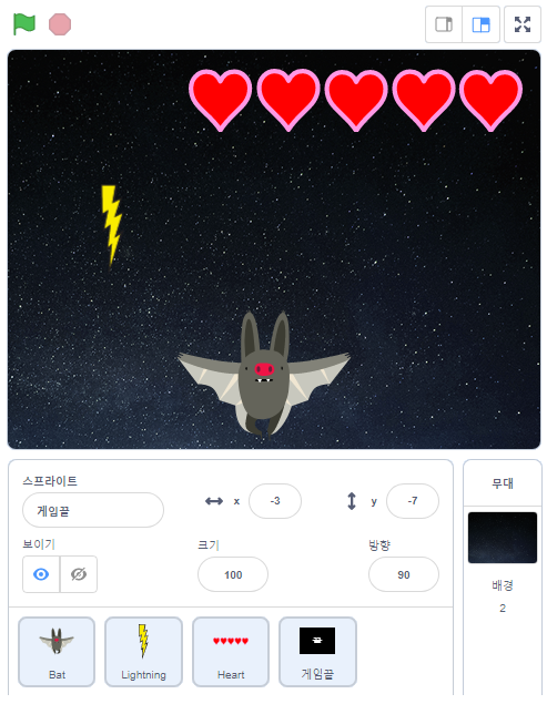 번개가 위에서 아래로 떨어지면 박쥐가 화살표키로 피하면서 움직입니다. 박쥐가 번개에 맞으면 하트가 하나씩 없어집니다. 하트가 모두 없어지면 끝이라고 화면이 나타나게 됩니다.