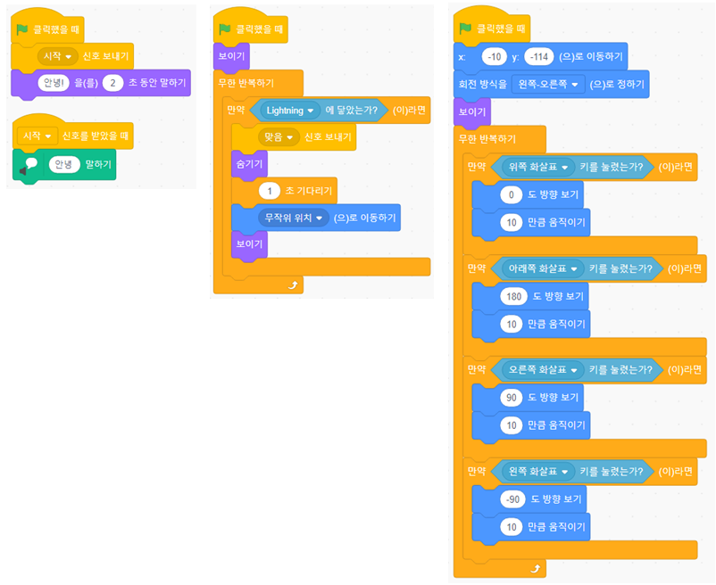 깃발을 클릭 할 때 안녕이라고 풍선말을 보여주고, 안녕이라고 목소리를 냅니다. 박쥐는 위, 아래, 오른쪽, 왼쪽 화살표키를 눌러서 움직입니다. 번개에 맞으면 숨었다가 1초 후에 무작위 위치로 보여집니다. 번개에 맞으면 맞음 신호를 보내서 하트가 줄어들게 합니다.