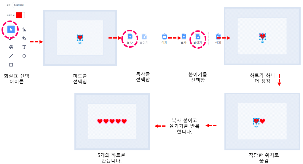 작게 만든 생명(Heart)의 모양을 5개 만듭니다. 생명(Heart) 모양의 하트를 하나씩 지우면서 복사합니다.