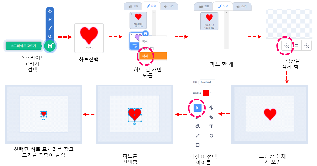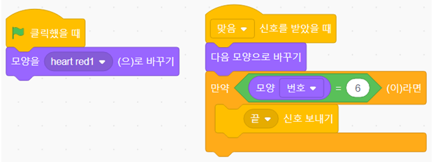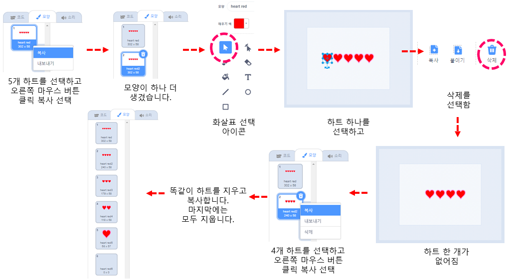 스프라이트 고르기에서 Heart를 선택합니다. 모양을 선택하고 오른쪽 마우스버튼 클릭하여 복사하고 모양을 바꾼 후에 다시 복사합니다.
