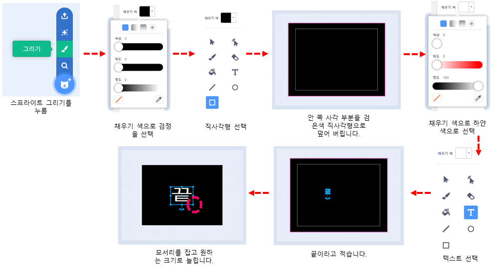 끝나는 화면을 스프라이트로 만들고 다른 스프라이트의 보다 맨 앞으로 보이도록 하면 간단히 게임의 끝을 알릴 수 있습니다. 끝나는 스프라이트는 다음 방법으로 그리면 됩니다.
