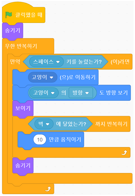 화살표키를 누르면 스프라이트가 방향을 보고 10 만큼씩 움직입니다.