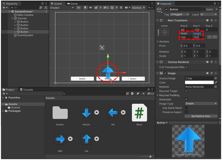 위 버튼 게임오브젝트에 위 화살표 이미지가 보입니다. 위 화살표 게임오브젝트의 크기를 조정하기 위해서 Inspector > Rect Transform의 Width, Hight를 100, 100을 변경합니다.