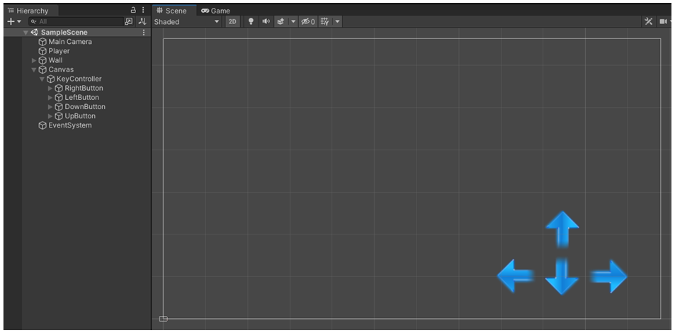 KeyController 게임오브젝트를 움직이면 화살표 버튼 게임오브젝트가 같이 움직입니다.