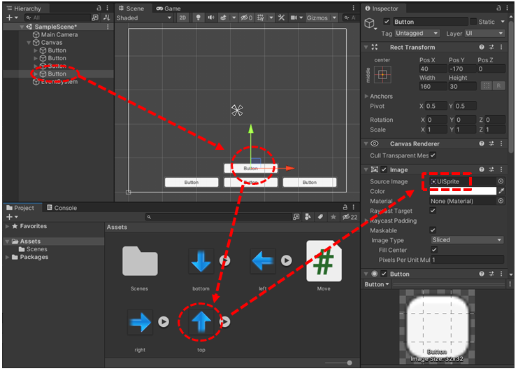 추가한 버튼 게임오브젝트에 화살표 이미지를 연결해 줍니다. 위 버튼 게임오브젝트를 선택하고 Project > Assets 폴더에서 top 이미지를 Inspector > Image > Source Image에 연결시켜 줍니다.