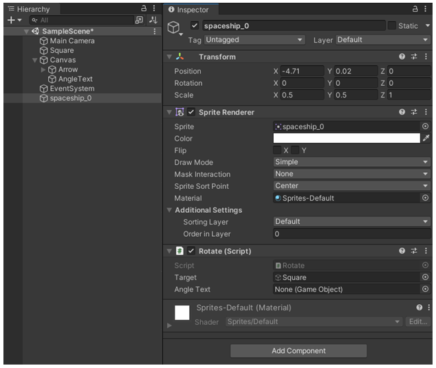 비행선에 Roate(Script) 컴포넌트가 추가되고, Target과 AngleText를 연결해 주세요