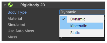 Rigidbogy 2D 컴포넌트가 추가되면 Square 게임오브젝트가 밑으로 떨어집니다. 떨어지지 않게 하려면 Rigidbody 2D > Body Type 에서 Kinematic을 선택합니다. 그러면 물리법칙이 적용되지 않습니다.