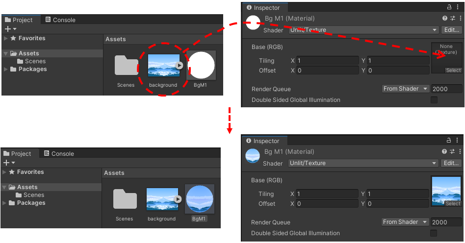 background 이미지를 BgM1의 Inspector창에서 Base(RGB)에 있는 None(Texture)에 끌어다가 놓습니다.
