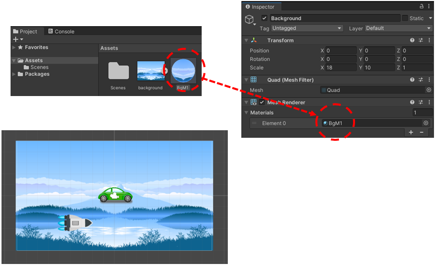 Background 게임오브젝트를 선택하고 Inspector창에서 Materials > Element0에 넣어줍니다.