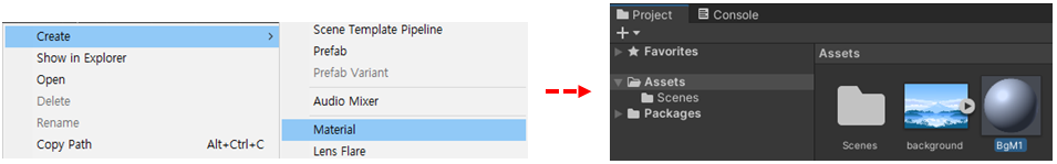 배경의 재질로 사용하기 위해서 Material 파일을 하나 만듭니다. Assets > 오른쪽 마우스 버튼 클릭 > Create > Material 선택 이름은 BgM1로 합니다.