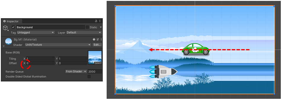 Background 게임오브젝트를 선택하고 Inspector창에서 맨 아래에 있는 BgM1(Meterial)의 Base(RGB)의 Offset에 있는 X에 마우스 커서를 가져다두고 좌우 드래그하면 값이 자동으로 바뀝니다.