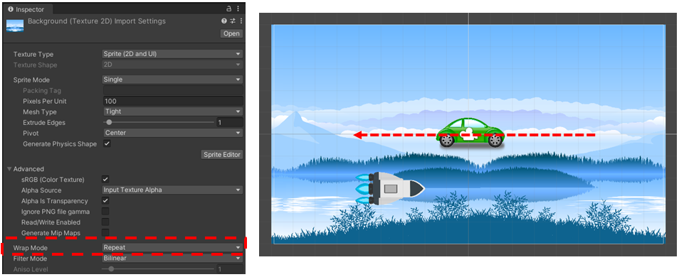 Assets폴더에서 background 이미지를 선택하고 Inspector 창에서 Wrap Mode를 Repeat로 변경합니다.