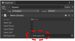 유니티에서 Square 게임오브젝트에 있는 Move(Script)에 Background 게임오브젝트를 연결해 줍니다.