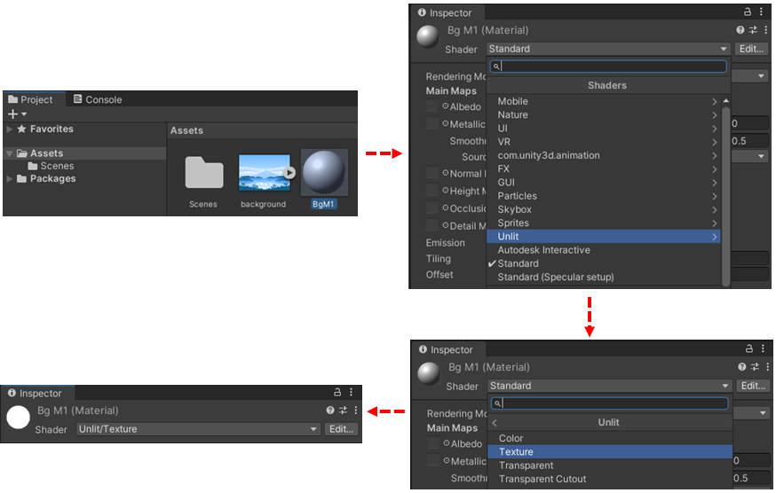 Assets>BgM1 Meterial을 선택하고 Inspector 창에서 Shader를 Unit > Texture로 변경합니다.