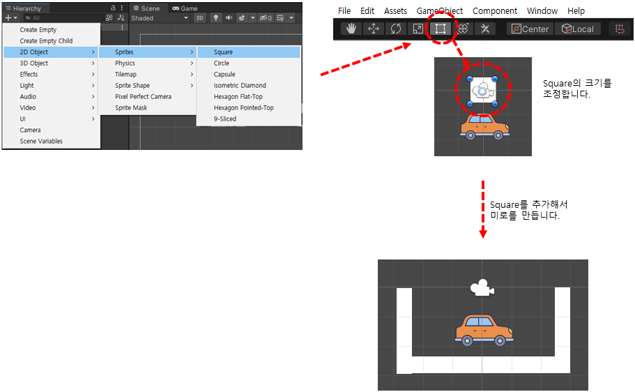 Hierarchy창에서 2D Object > Sprites > Squre 를 이용해서 미로를 만듭니다.