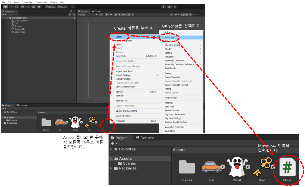 Hierarchy창에 Car 게임오브젝트를 움직이도록 하기 위해서 Move.cs 이란 C#을 만듭니다.