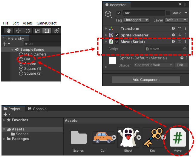 Hierarchy창에 있는 Car 게임오브젝트에 Move.cs 이란 C#을 연결하기 위해서 Assets 폴더에 있는 Move.cs를 왼쪽 마우스버튼으로 잡고서 끌어다가 Hierarchy창의 Car 게임오브젝트에 놓습니다. 그러면 Car 게임오브젝트의 Inspector 창에 Move(Script) 컴포넌트가 추가 됩니다.