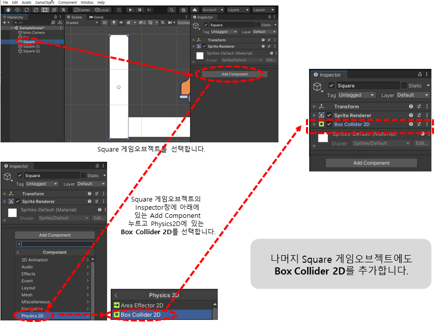 벽으로 추가한 Square 게임오브젝트에는 Box Collider 2D 컴포넌트를 추가합니다.