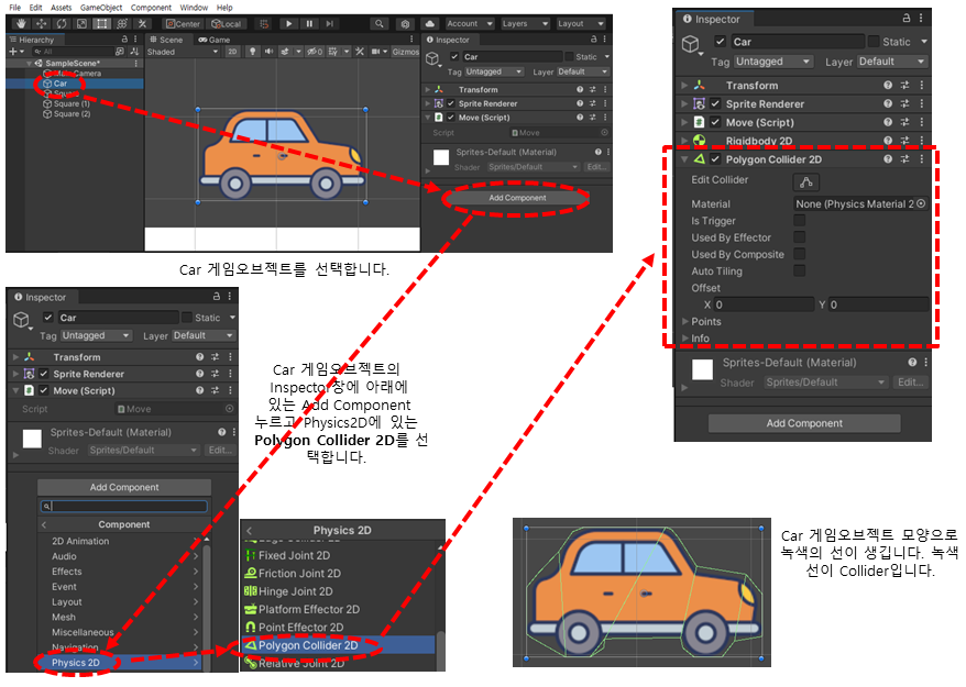 Car 게임오브젝트의 모양처럼 Collider를 그려주려고 Polygon Collider 2D 컴포넌트를 추가합니다.