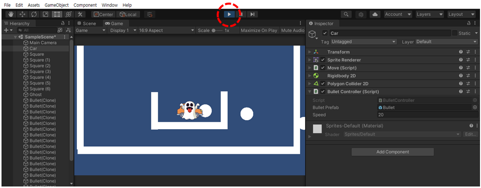 Assets 폴더의 Bullet.prefab 파일을 Car 게임오브젝트에 있는 BulletController(Script) 컴포넌트에 있는 BulletPrefab의 None(GameObject)에 넣습니다. 플레이 버튼을 클릭하여 Car 게임오브젝트에서 Bullet이 발사되는지 확인합니다.