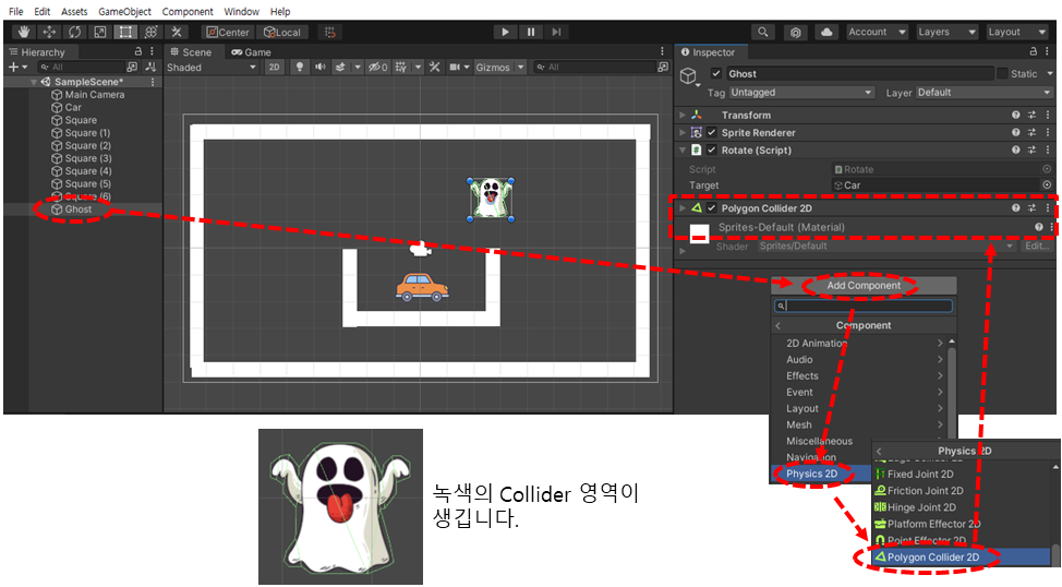 Ghost 게임오브젝트에 Polygon Collider를 적용합니다.