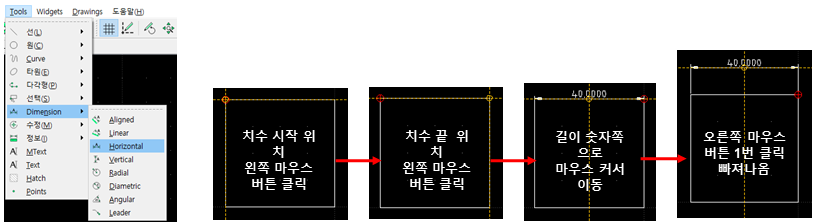 Tools > Dimention > Horizontal 을 선택합니다. 그린 도형에서 치수 시작 위치에 마우스 커서를 놓고 왼쪽 마우스 버튼을 클릭하고 치수 끝나는 위치에 다시 한번 마우스 커서를 놓고 왼쪽 마우스 버튼을 클릭합니다. 마우스를 생성된 길이 텍스트 쪽으로 움직인 후 위로 끌어 올립니다. 마우스 오른쪽 버튼 클릭으로 빠져 나옵니다.