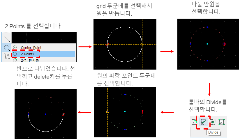 제일 편하게 사용하는 것이 2Points로 원지름의 시작과 끝을 찍으면 지름대로 원이 만들어집니다.
