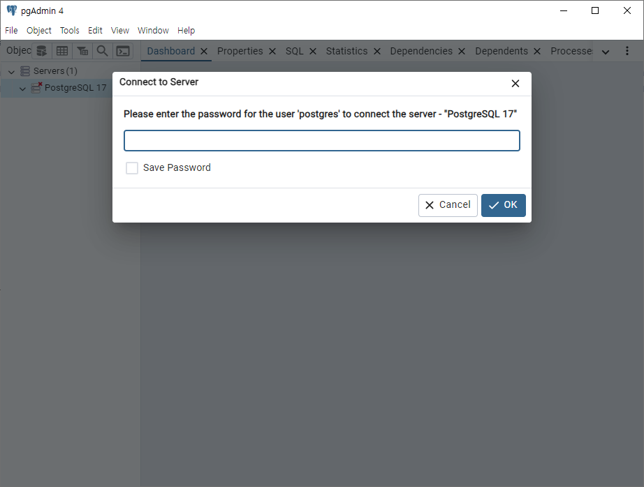 위에서 설정한 postgres의 비밀번호를 입력합니다. Save Password를 체크하면 다음 실행부터는 바로 pgAdmin4가 실행됩니다.