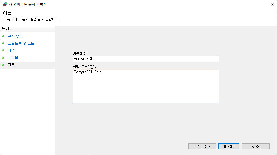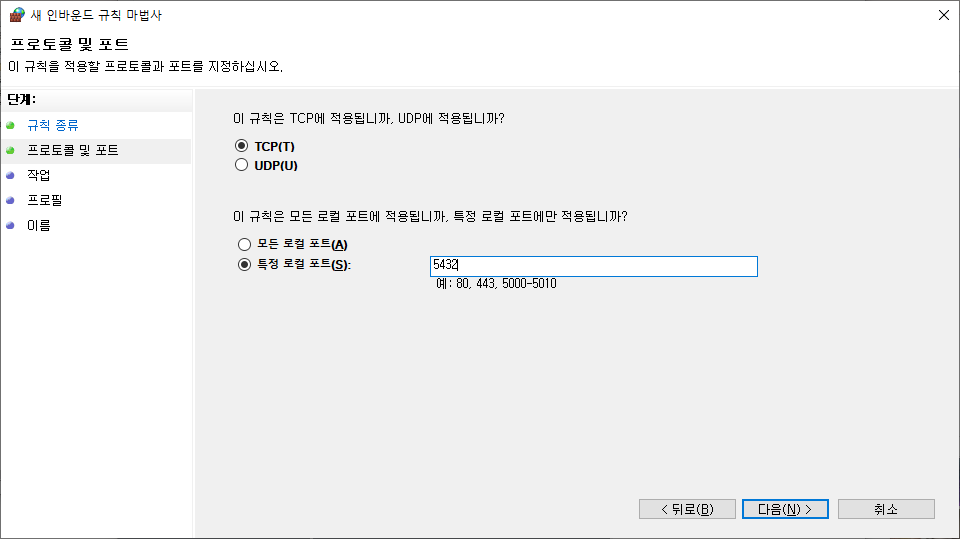 TCP의 특정 로컬 포트에 5432를 넣습니다.