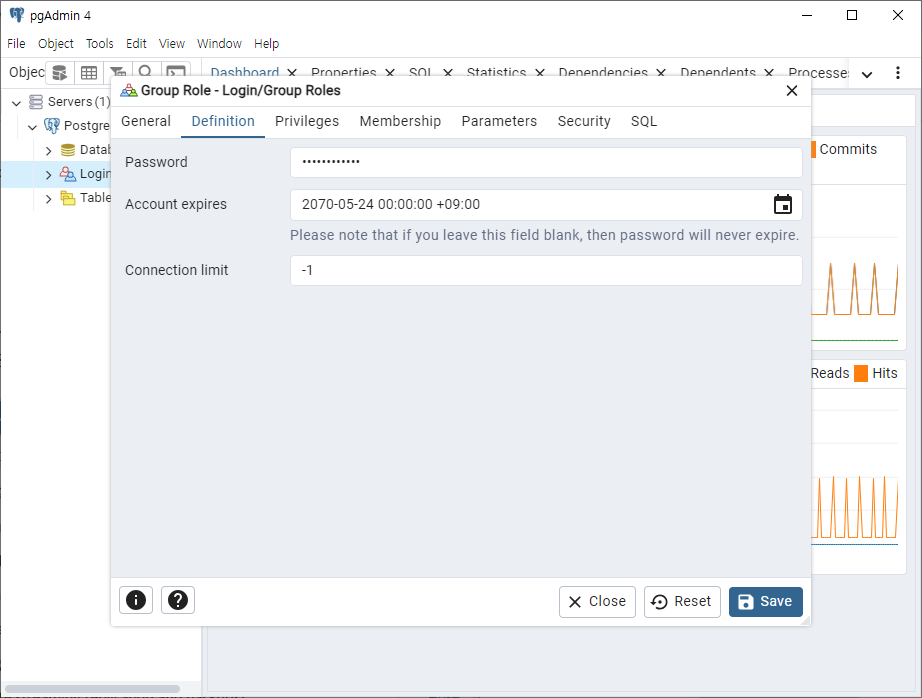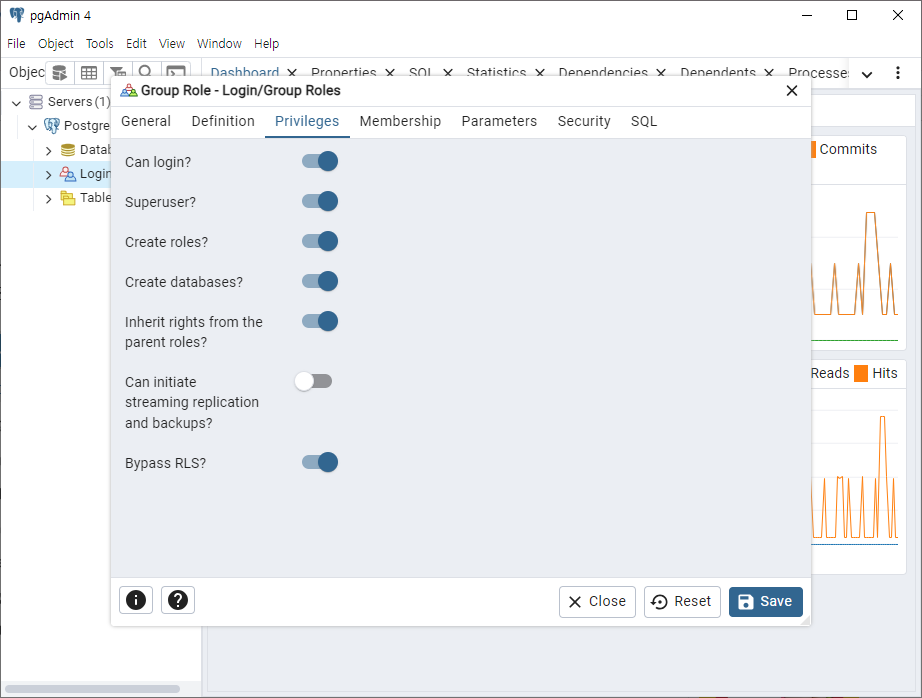 Privileges에서 Can login?, Superuser?를 체크합니다. 체크하면 나머지도 설정이 같이 변경됩니다.