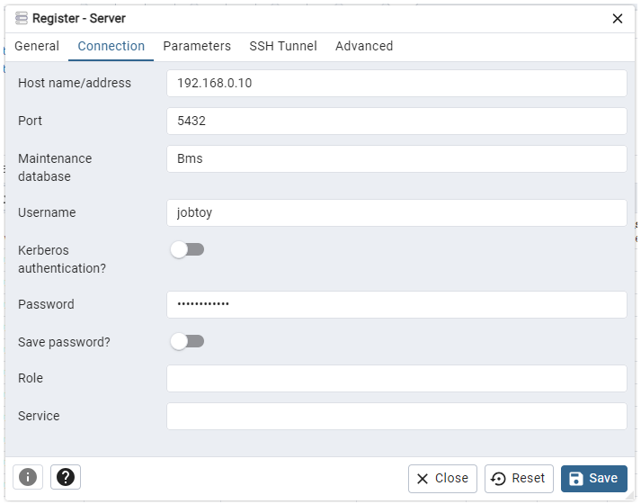 Connection의 Host name/address에 접속할 IP주소를 적습니다. Port는 기본 포트인 5432입니다. Username과 Password를 적습니다.