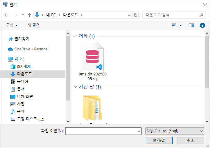 백업 받아둔 *.sql 파일을 선택하기 위해서 폴더 아이콘을 선택합니다.