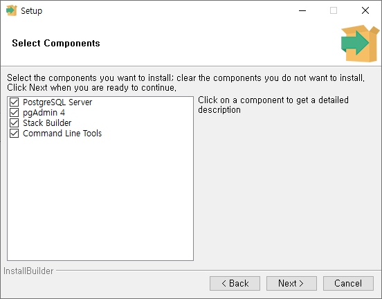 Stack Builder는 설치하지 않습니다. 기본 세팅되어 있는 체크 박스를 선택을 풀어줍니다.