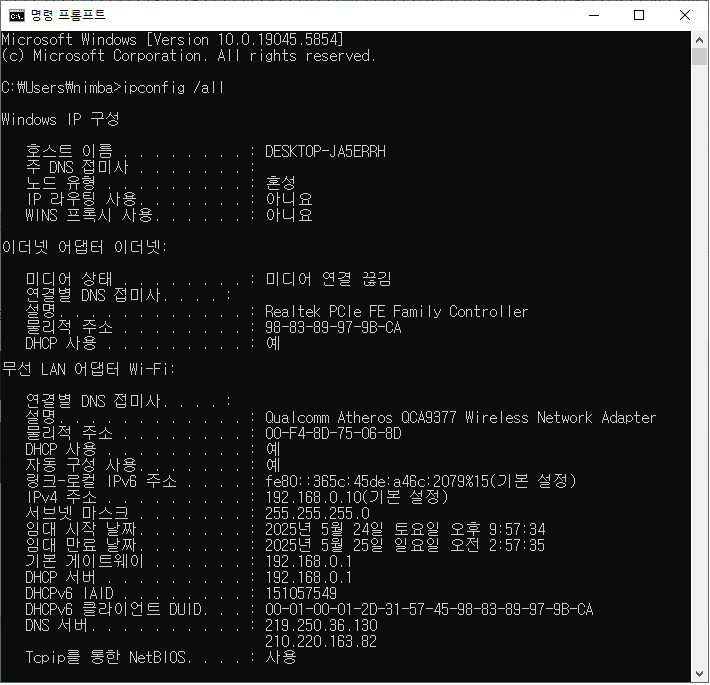 Database 가 설치된 PC의 IP 주소를 확인하기 위해서 명령프롬프트를 실행하고 ipconfig /all 명령어를 실행합니다. IPv4 주소를 확인해 볼 수 있습니다. 여기서는 192.168.0.10입니다.