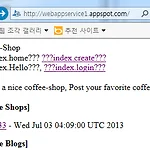 [gae] JavaShop 예제 소스 실행하기 예제) lib는 용량이 많아서 제외했습니다. 소스에서 google map key는 제외했습니다. 소스에서 'Google Map API Key 값을 넣으세요'를 찾아서 바꾸어주면 됩니다. JavaShop을 배포했습니다. 로그인 부분에서 오류가 발생하지만 구글 map key를 등록하여 구글 맵과 간단한 등록, 조회가 가능한 것을 보았습니다. 로그인 로그아웃 등록 조회 구글map 1. webappservice1.appsopt.com 접속 2. login 로그인 성공 > 오류 발생 다시 webappservice1.appsopt.com 접속함 로그인 되어 있음 3. ???index.create??? 클릭함 Title, Content 입력하고 Save 클릭하기 등록 성..
